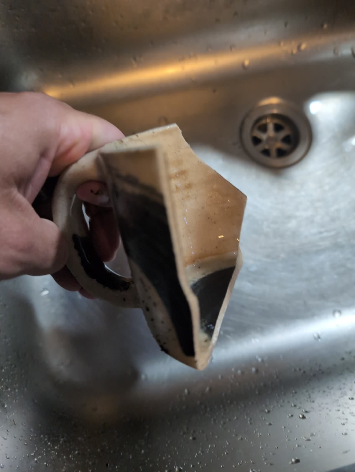 It was a custom created piece of pottery that was gifted to me and every morning I enjoyed making a fresh cup of organic coffee and pouring it into my custom oversized mug….